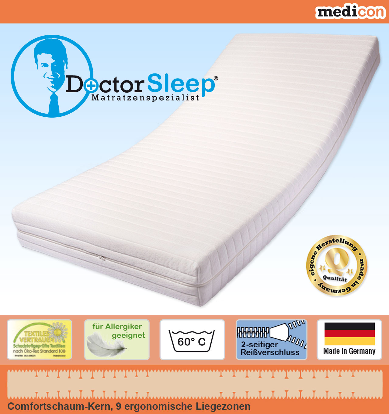Mit einem feinporigen und atmungsaktiven 18 cm hohen langlebigem Comfortschaum-Kern versehen, gilt medicon als Klassiker in der Matratzenwelt von DoctorSleep®. Mit 9 Liegezonen, die eine hervorragende Anpassung an den Körper bieten, ist die Matratze ein Garant für einen erholsamen Schlaf. Lieferbar ist medicon in zwei Härtegraden: H2 und H3 - H4. Der Oberbezug mit 2-seitigem Reißverschluss ist frei wählbar: Aloe Vera, Medicool®, Medipur® oder Cashmere. Auch diese Matratze und die Bezüge sind nach Öko-Tex Standard 100 gefertigt und für Allergiker geeignet. Erhältlich in allen Standard- und Sondergrößen.