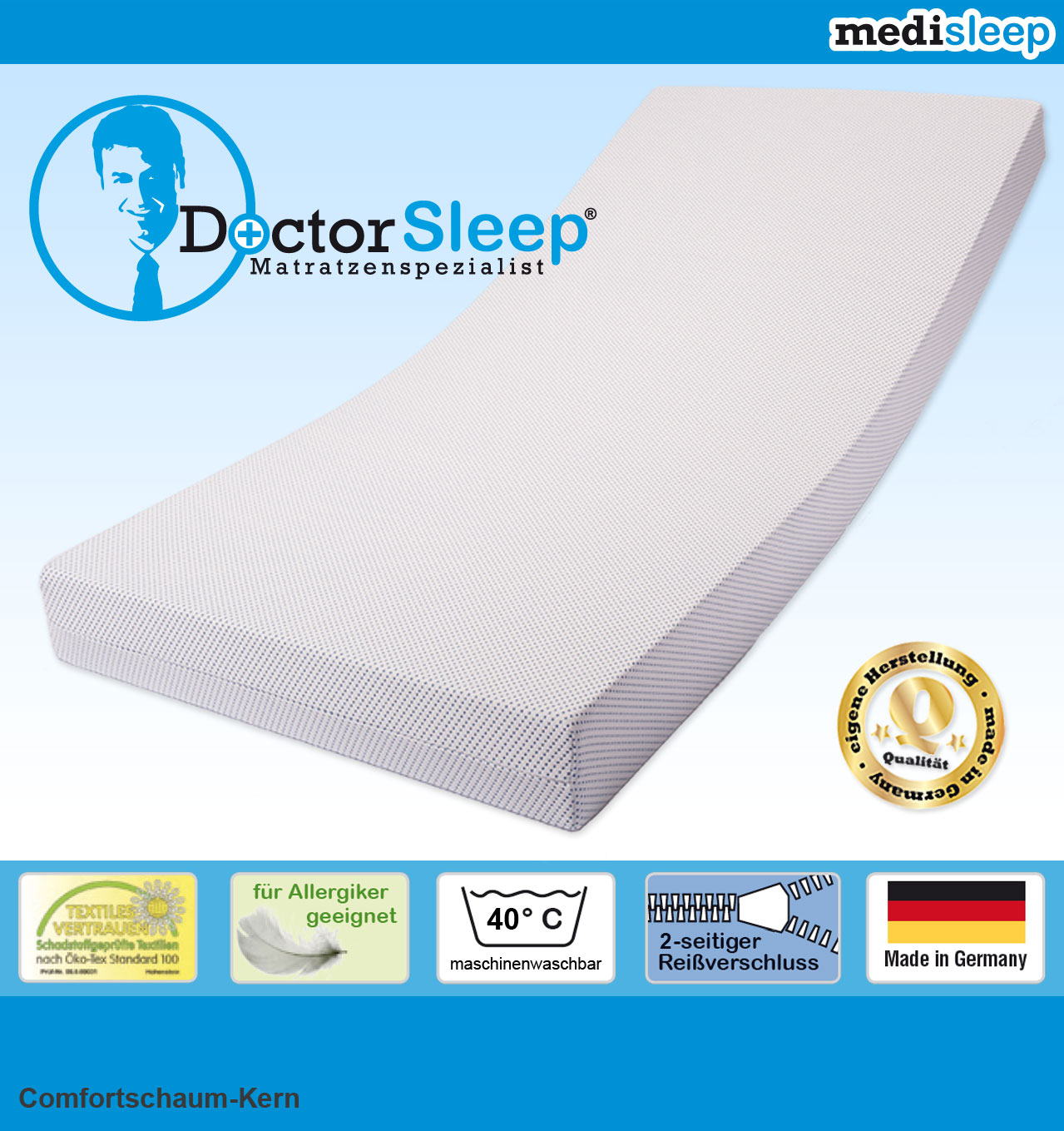 Aus hochwertigem Comfortschaum bestehend ist medisleep besonders feinporig und atmungsaktiv und eignet sich damit auch für Allergiker. Mit ihrem fast sensationell niedrigen Preis bietet die Matratze den idealen Einstieg in die Matratzenwelt von DoctorSleep®. und ist auch für den kleinen Geldbeutel erschwinglich. Wählbar ist medisleep mit wahlweise 10, 12 oder 15 cm Kernhöhe ohne Unterbezug sowie in den zwei Härtegraden H2 und H3 - H4. Dank eines 2-seitigen Reißverschlusses lässt sich der robuste Oberbezug leicht abnehmen und in der Maschine bei 60° waschen, was nicht nur Familien mit Kindern sehr schätzen. Matratze und Bezug sind nach Öko-Tex Standard 100 gefertigt, erhältlich ist die Matratze in allen Standardgrößen sowie in Sondergrößen.